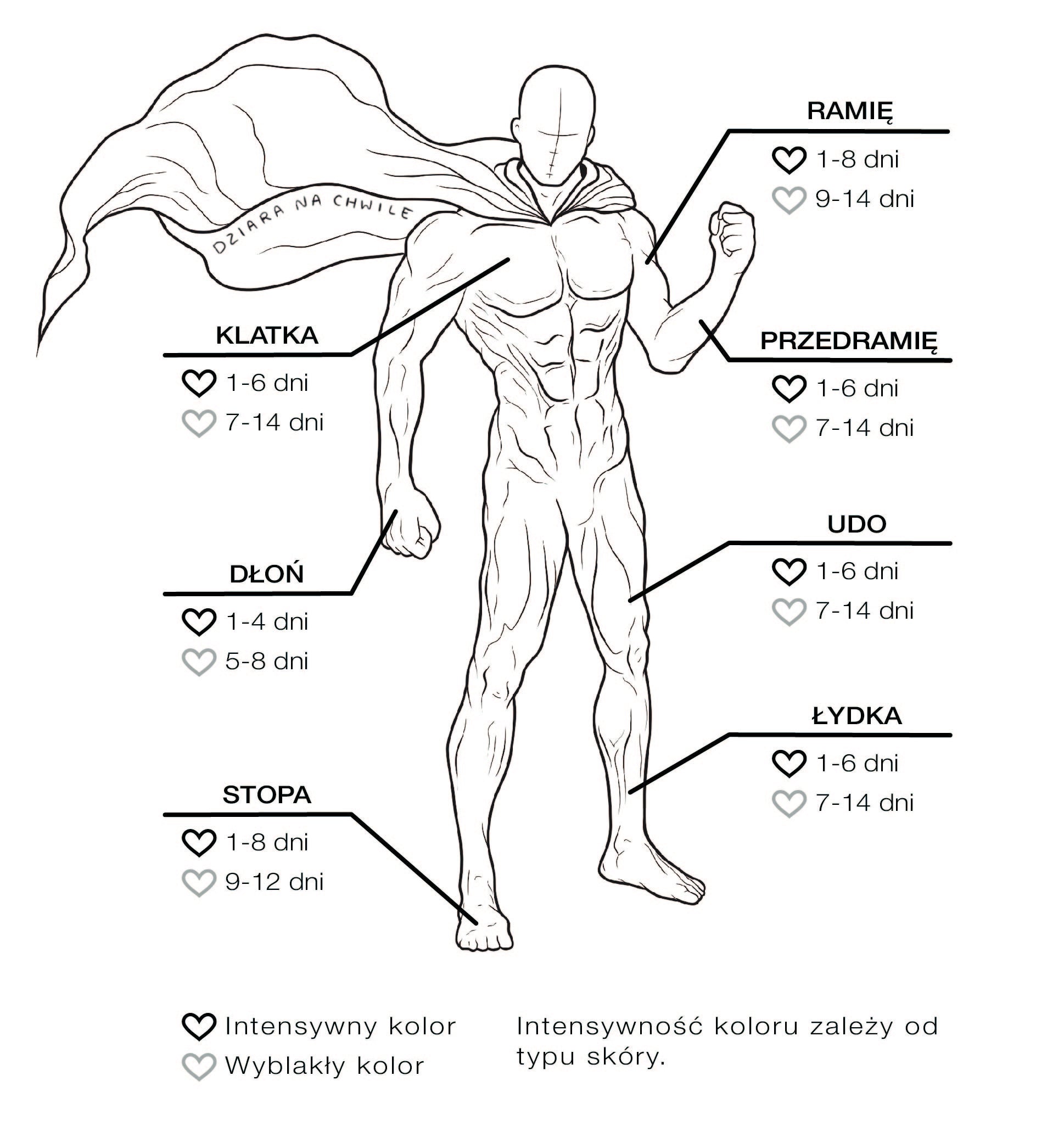 Grafika obok przedstawia orientacyjny czas, przez jaki tatuaż Jagua utrzymuje się na różnych partiach ciała. Pamiętaj jednak, że rzeczywista trwałość tatuażu zależy od indywidualnych czynników, takich jak rodzaj skóry, sposób jej pielęgnacji, a także stopień narażenia na tarcie i kontakt z wodą.